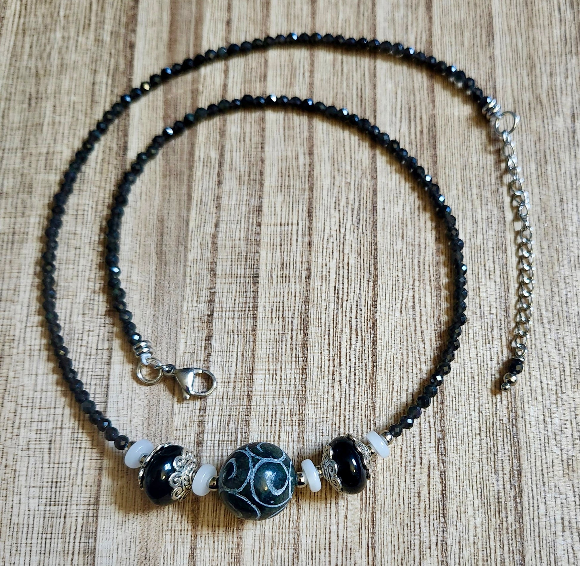 Elevate your style with our Black and White Agate necklace, featuring small faceted beads of Black Agate and Onyx, accented by a hand carved stone bead. Handmade with care, this 18-inch necklace also includes a 2-inch extension chain for the perfect fit.