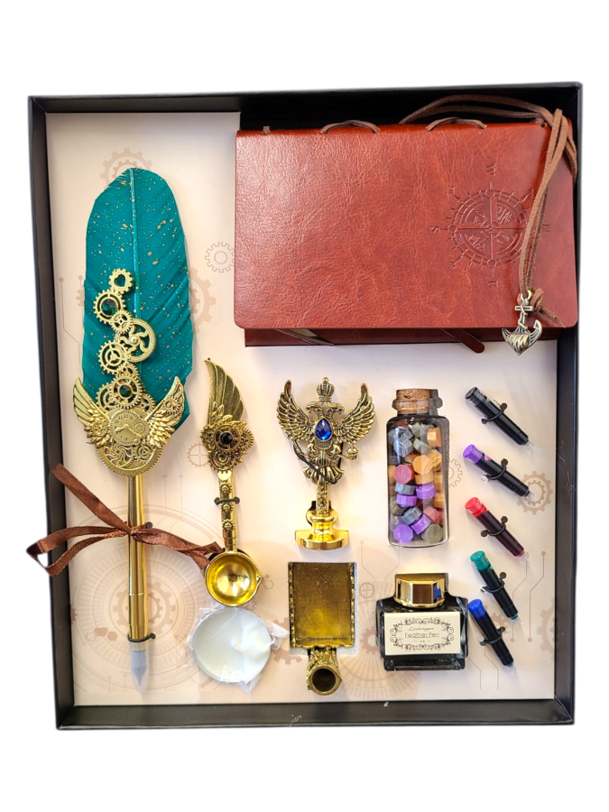 Blue Steampunk Feather Quill Pen Dip Set
