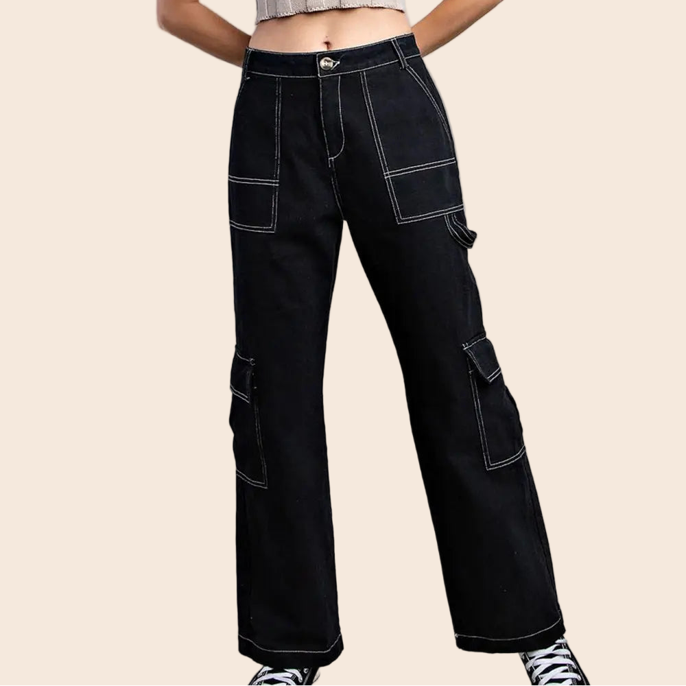 Versatile cargo straight leg pants crafted from 100% cotton for everyday comfort. Designed with functional side hip pockets, back pockets, and dual cargo pockets for ample storage. Features a secure button and zipper closure with contrasting seams that add visual interest to the classic silhouette. Perfect for casual wear or outdoor activities.