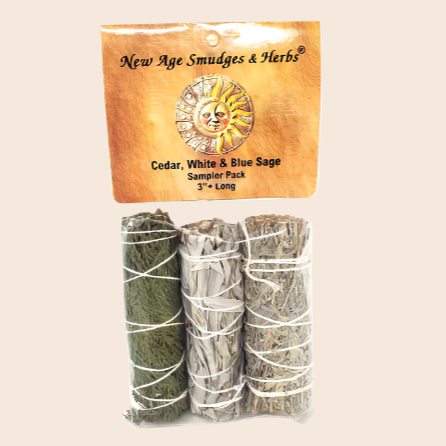 Experience the soothing benefits of our Cedar, White & Blue Sage Smudge Sampler. Perfect for trying different smudges to find your ideal cleansing ritual. Unwind and relax as you purify your space with the calming scents of cedar, white sage, and blue sage.