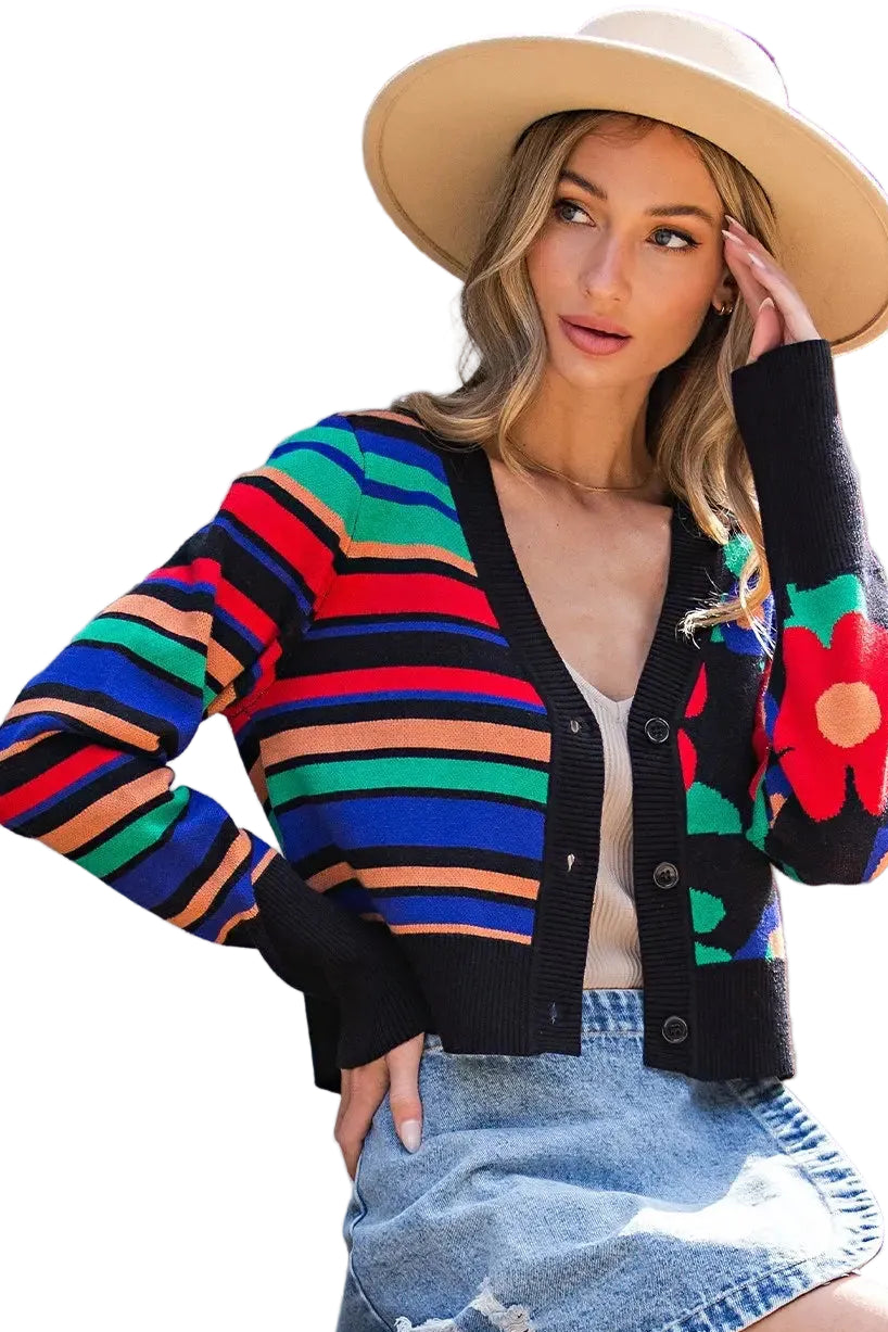 Elevate your layering game with this mixed print cardigan, combining delicate florals with classic stripes for effortless style versatility. The cropped silhouette pairs perfectly with high-waisted bottoms, while three front buttons allow easy adjustable coverage. Soft ribbed cuffs provide a polished finish. Crafted from a breathable blend of 50% viscose, 28% polyester, and 20% nylon for comfort and durability.
