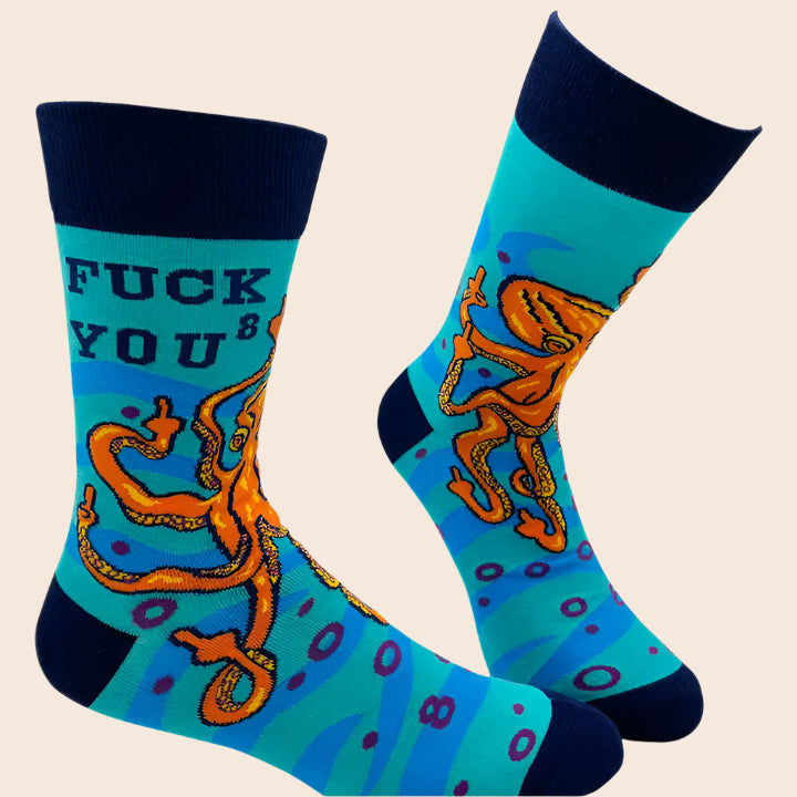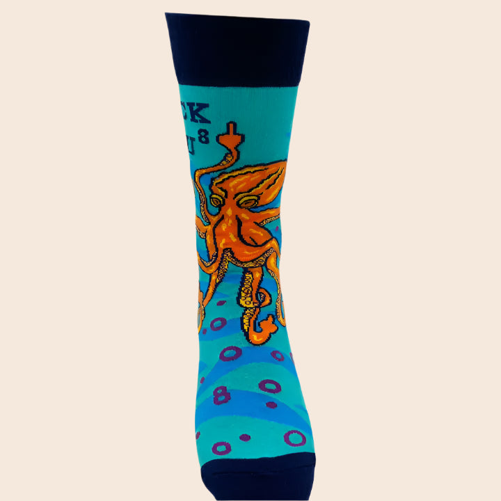 "Fuck You^8" men's socks with an orange octopus on a blue background. Fits men's shoe sizes 7-12.5.