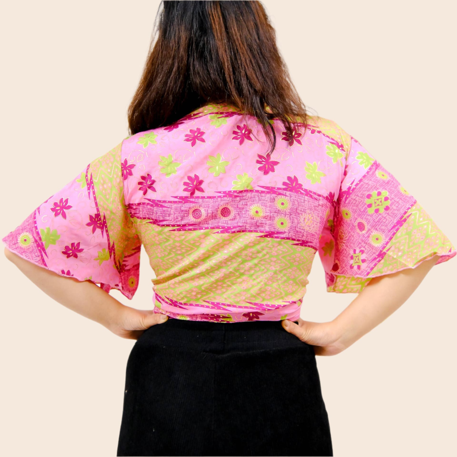 Embrace retro chic with this bohemian wrap crop top made from ethically sourced and fairtrade recycled silk material. The three way tie top and flare half sleeve make it a versatile and stylish addition to any wardrobe. Wear it tied in the front, wrapped and tied in the back, or let it flow freely for a boho-inspired look. One-size-fits-most (S-L).