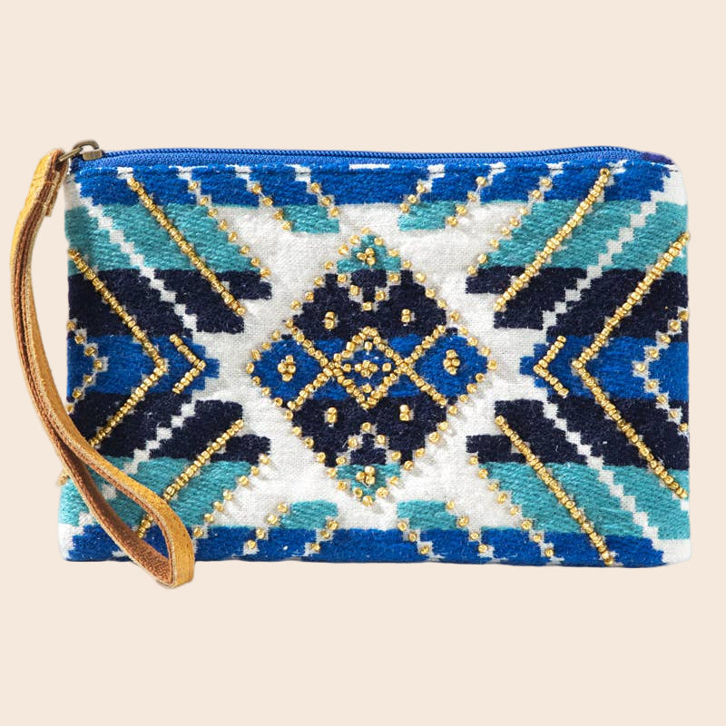 Crafted from delicate cotton yarn dye with a rich jacquard pattern, this ethnic-inspired clutch features a suede leather trim and sleek polyester lining. Measuring approximately 5.25" in length and 8.50" in width, it also includes a convenient wristlet strap measuring 7" in length.