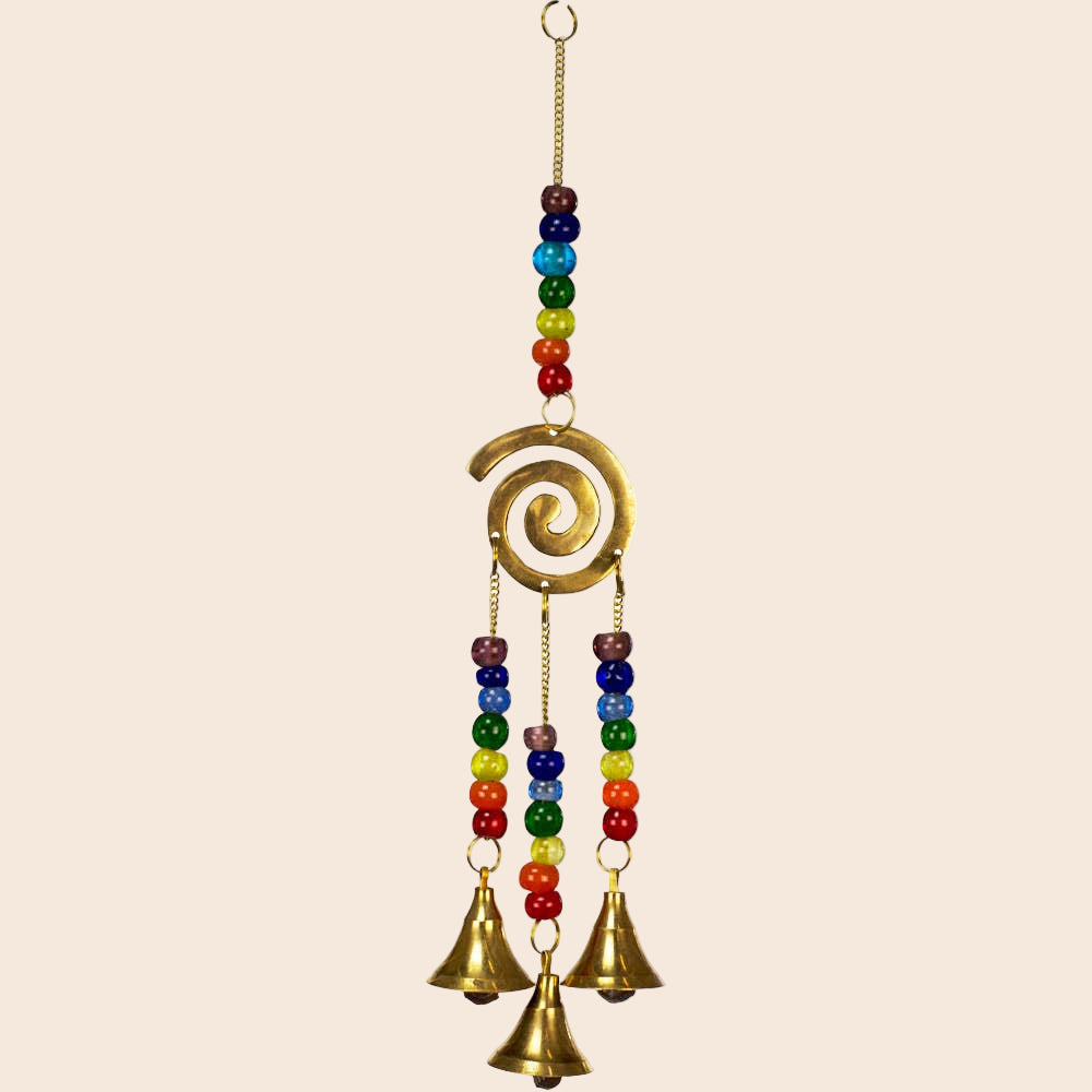 Hanging Bells Chakra Spiral features a 12-inch brass spiral design adorned with delicate bells and vibrant rainbow glass beads. The combination of traditional brass craftsmanship and colorful beadwork creates an eye-catching decorative piece. Perfect for adding visual interest to any space, this hanging ornament blends metallic elegance with cheerful, multicolored accents. The gentle chime of the bells adds an auditory element to your décor.