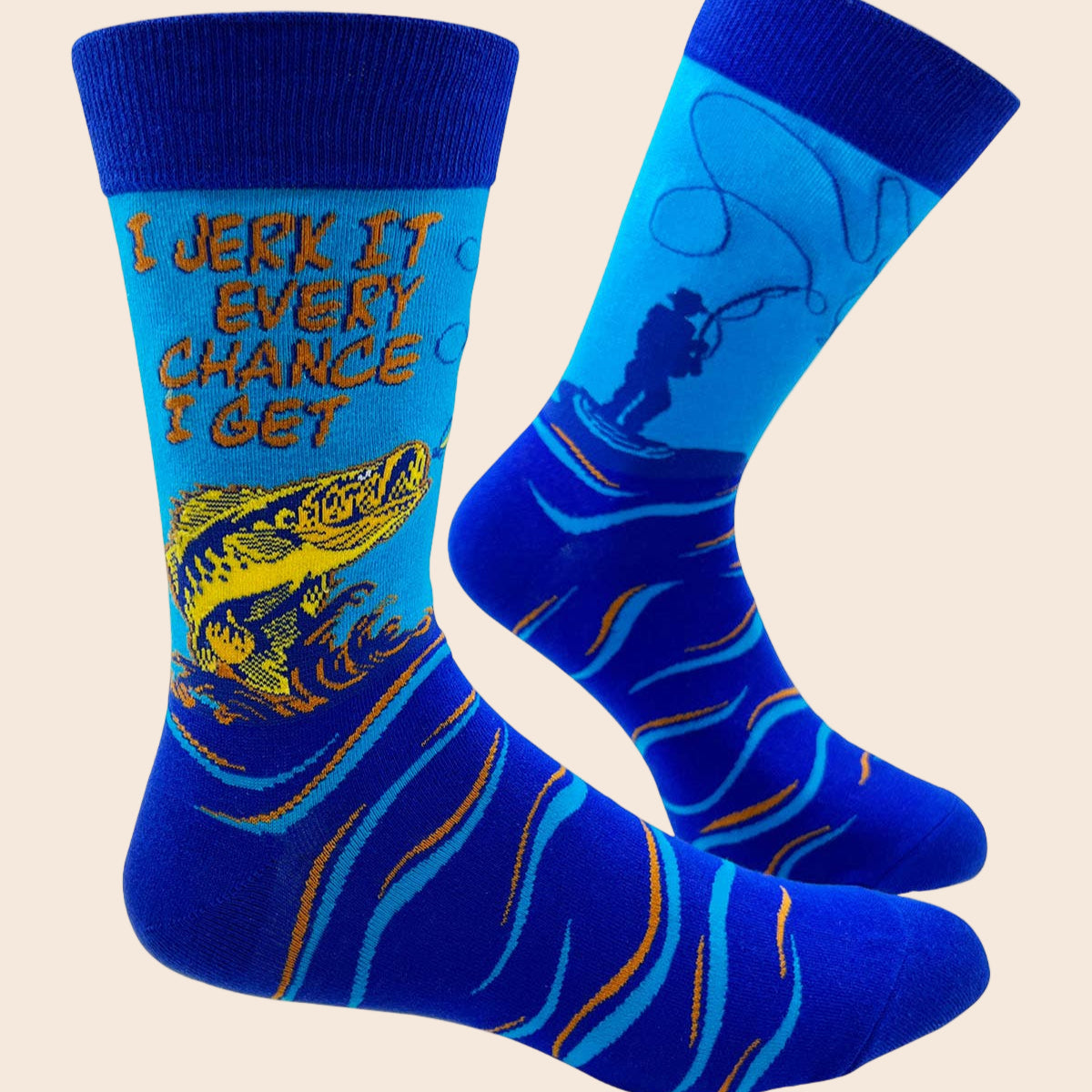 "I Jerk It every Chance I Get." Socks featuring a fisherman and a fish. Men's shoe size 7 to 12. 80% Cotton, 15% Nylon, 5% Spandex.