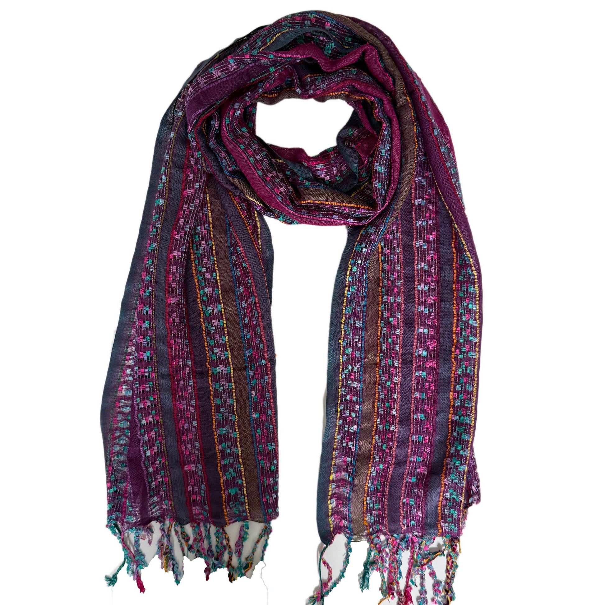 Fun multi color woven made from silky soft viscose. Finished with twisted fringe.