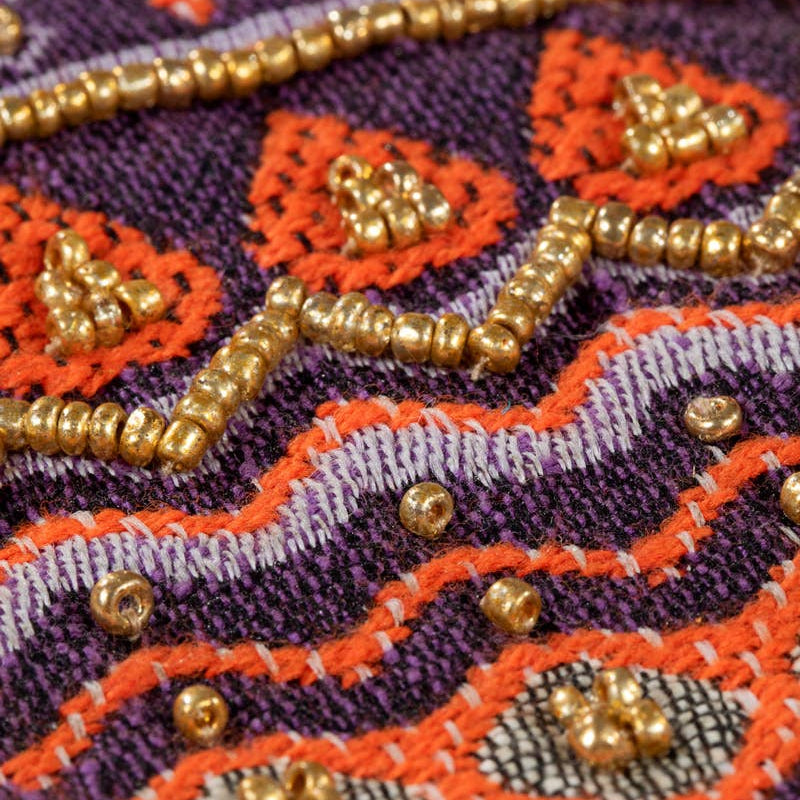 Handcrafted from fine cotton yarn, this jacquard clutch features an ethnic pattern with zigzag bead detailing. It includes a leather wristlet for easy carrying. Made with a 100% cotton shell, suede leather trims, and a 100% polyester lining. Dimensions are approximately 5.25" in length, 8.50" in width, with a 7" wristlet.