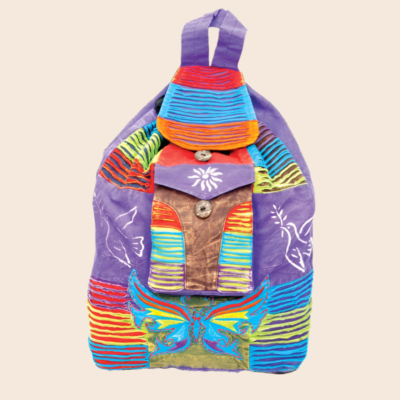 The Multicolored Butterfly Backpack measures 18" x 15" and features an adjustable closure to ensure a secure and comfortable fit. It includes a convenient front pocket, perfect for storing small essentials like keys, phones, or snacks. Its vibrant butterfly design adds a touch of color and personality.