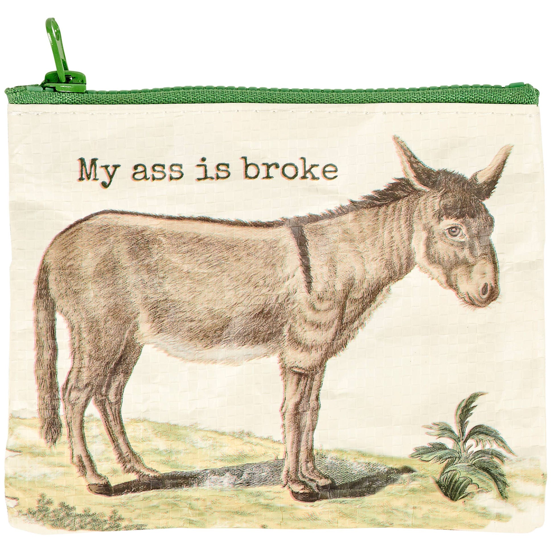 A double-sided zipper wallet from our Farmhouse Collection displaying vintage art of a donkey with a fun donkey pun that reads "My Ass Is Broke." Donkey wallet includes a top zipper closure in coordinating green color for easily securing items inside. Our My Ass Is Broke zipper wallet is made from eco-friendly post-consumer material and is perfectly sized to hold daily on the go items. Accessories pictured not included. A fun farm-themed everyday accessory perfect for on the go organization.