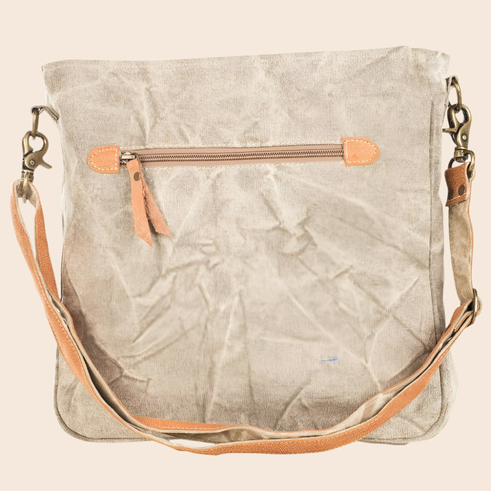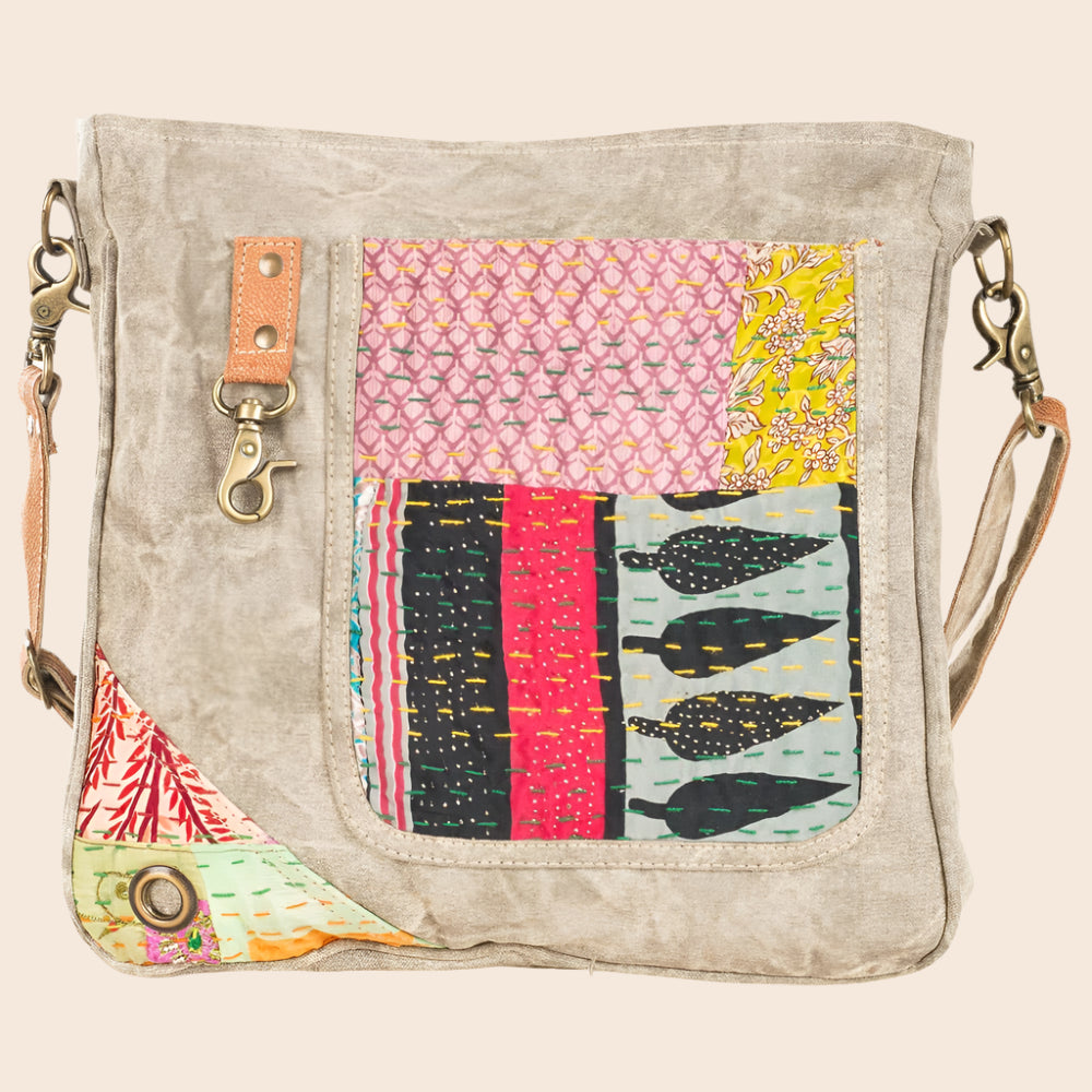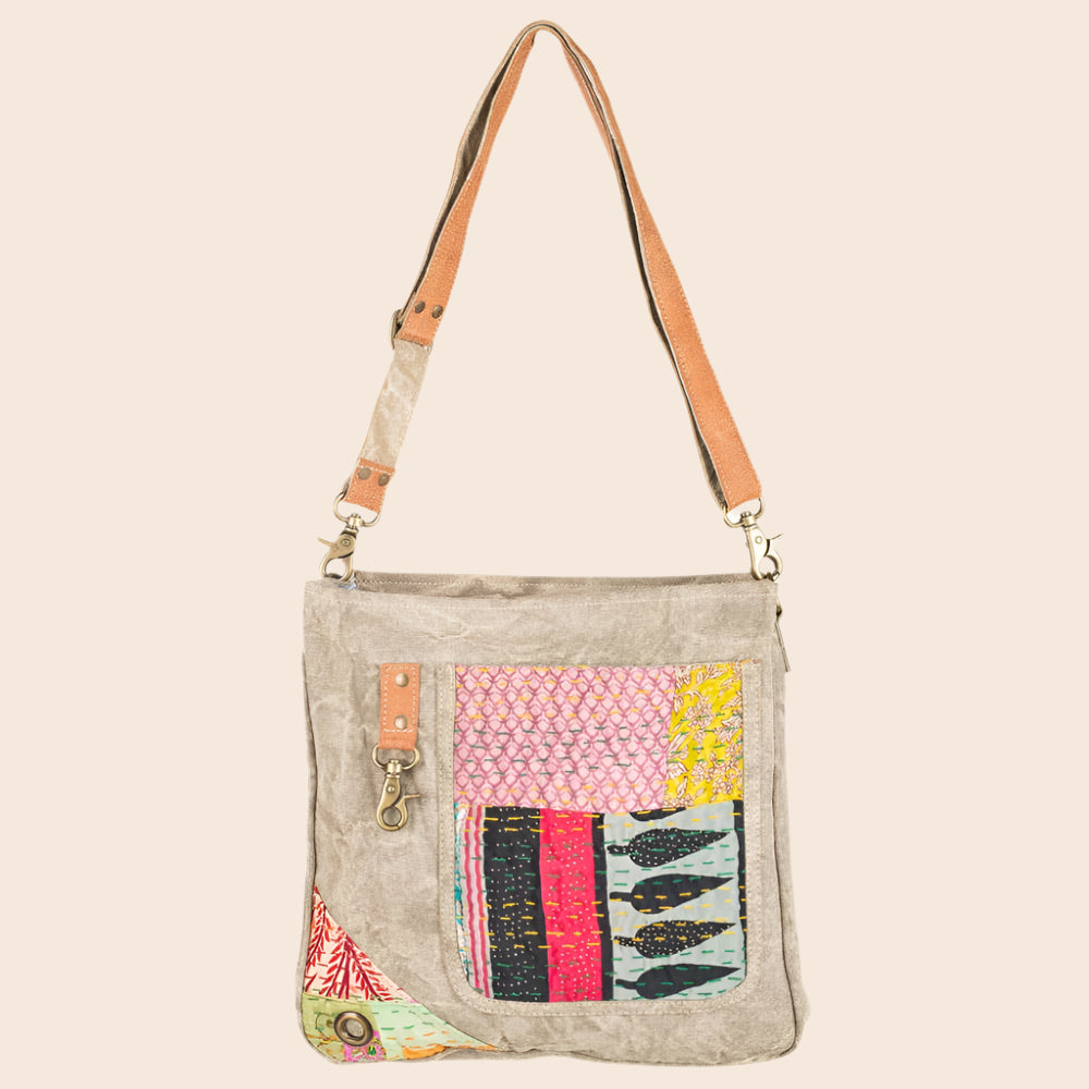 This recycled canvas shoulder bag features Kantha stitching, with each bag showcasing unique color variations. Measuring 8" x 11" x 2", it offers a practical size for everyday use.