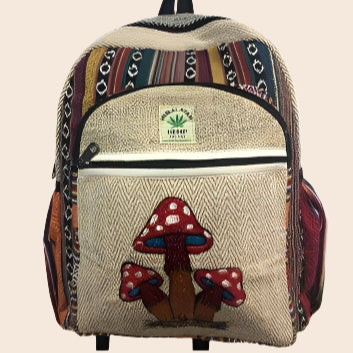The Embroidered Mushroom Backpack is crafted from a durable blend of cotton and hemp, measuring 12" x 15". It features two front pockets, one large pocket, two elastic side pockets, and a laptop sleeve for convenient storage. Adjustable straps provide a customizable fit, making it a practical and stylish choice for daily use.
