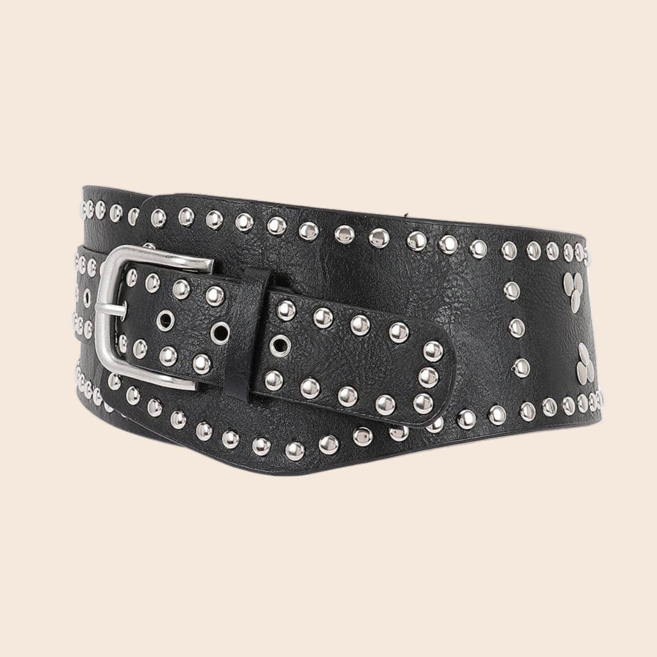The Riveted Eyelet Belt is a bold accessory measuring approximately 4 inches wide and 42 inches long. Featuring multiple rows of riveted metal studs and a classic buckle, this wide belt offers a striking, edgy accent that can elevate everyday outfits or add a touch of rugged style. Its sturdy materials ensure lasting wear, making it a practical choice for anyone looking to combine fashion with functionality. Ideal for adding structure and flair to your wardrobe, this belt balances classic and contemporary design elements seamlessly.
