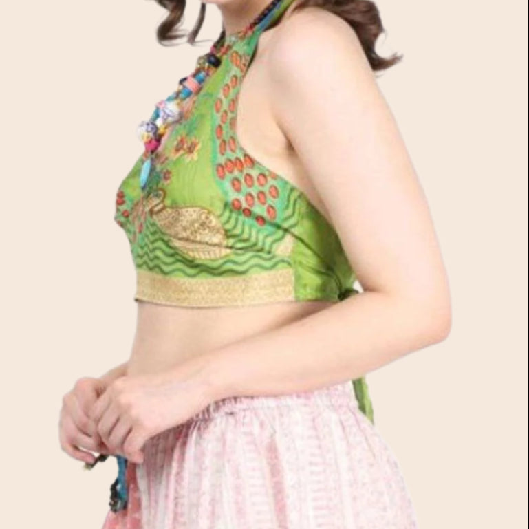 Made of 80% silk and 20% viscose, it feels soft and drapes beautifully. The halter design flatters the neck and waist, while the V-neck adds a touch of sophistication. Bust measurement at 36 inches and length at 14 inches.