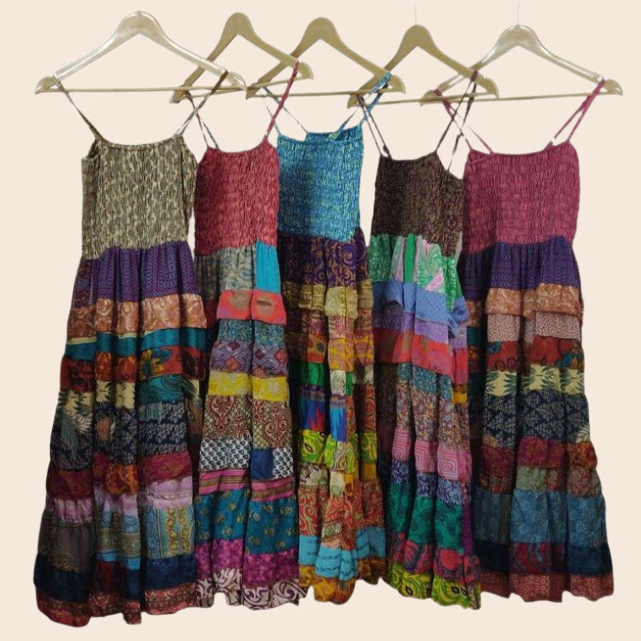 This Smocked Bodice Ruffle Frill Dress features a unique patchwork design, ensuring each piece is one of a kind. Made from a comfortable blend of polyester and silk, it fits bust sizes from 26 to 58 inches and has a length of 42 inches and has adjustable straps. The smocked bodice and ruffle frills add subtle texture and style, making it a versatile choice for various occasions.