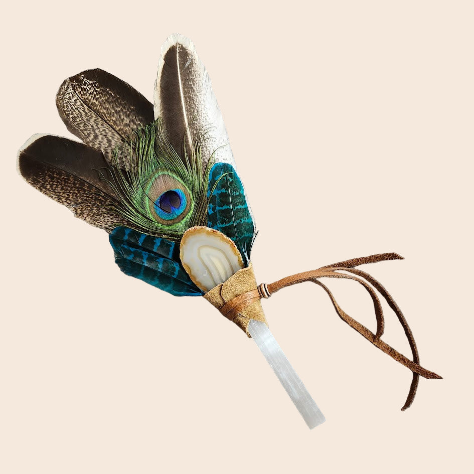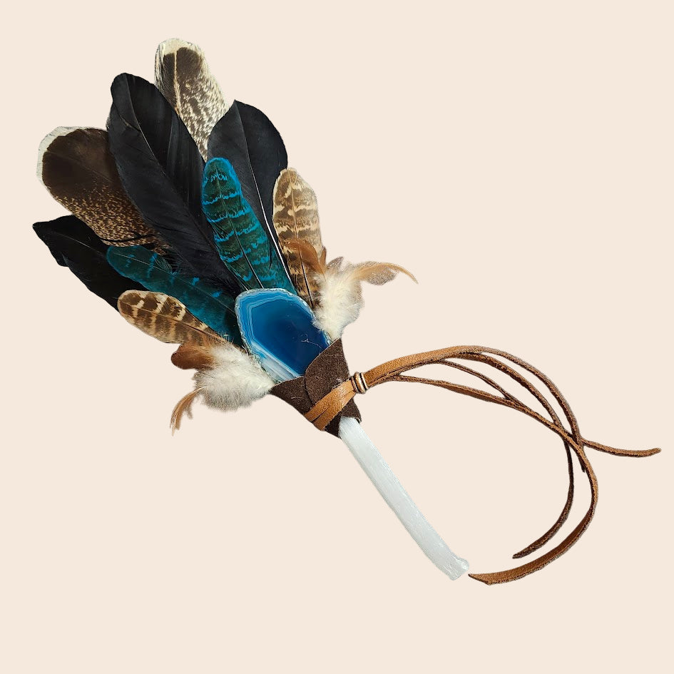 Enhance your smudging rituals with these 12" x 6" Smudge Fans, crafted from genuine selenite, leather, feathers, and agate slices. Each fan is thoughtfully designed to help you gently disperse cleansing smoke, promoting positive energy and balance in your space. Durable yet elegant, these fans support your mindful practices with natural materials that connect you to the earth’s calming energy.