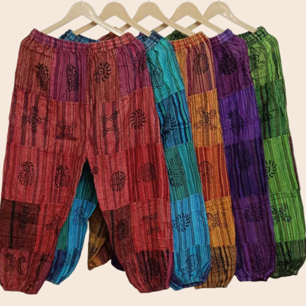 Made from soft and breathable cotton, these pants feature a unique patchwork multicolor pattern for a statement look. The elastic ankles provide a snug fit while the waist, measuring from 30-50 inches, and the hip, measuring at 52 inches, ensure a comfortable and flattering fit for a range of body types.