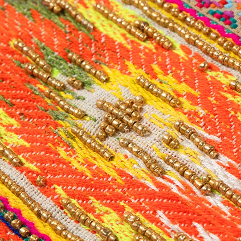 Crafted from delicate cotton yarn dye with a rich jacquard pattern, this ethnic-inspired clutch features a suede leather trim and sleek polyester lining. Measuring approximately 5.25" in length and 8.50" in width, it also includes a convenient wristlet strap measuring 7" in length.