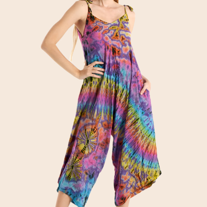 This tie-dye romper features adjustable tie straps for a customizable fit and a loose, flowy design that ensures comfort and ease of movement. Perfect for casual outings or relaxed days, it combines style with practicality.