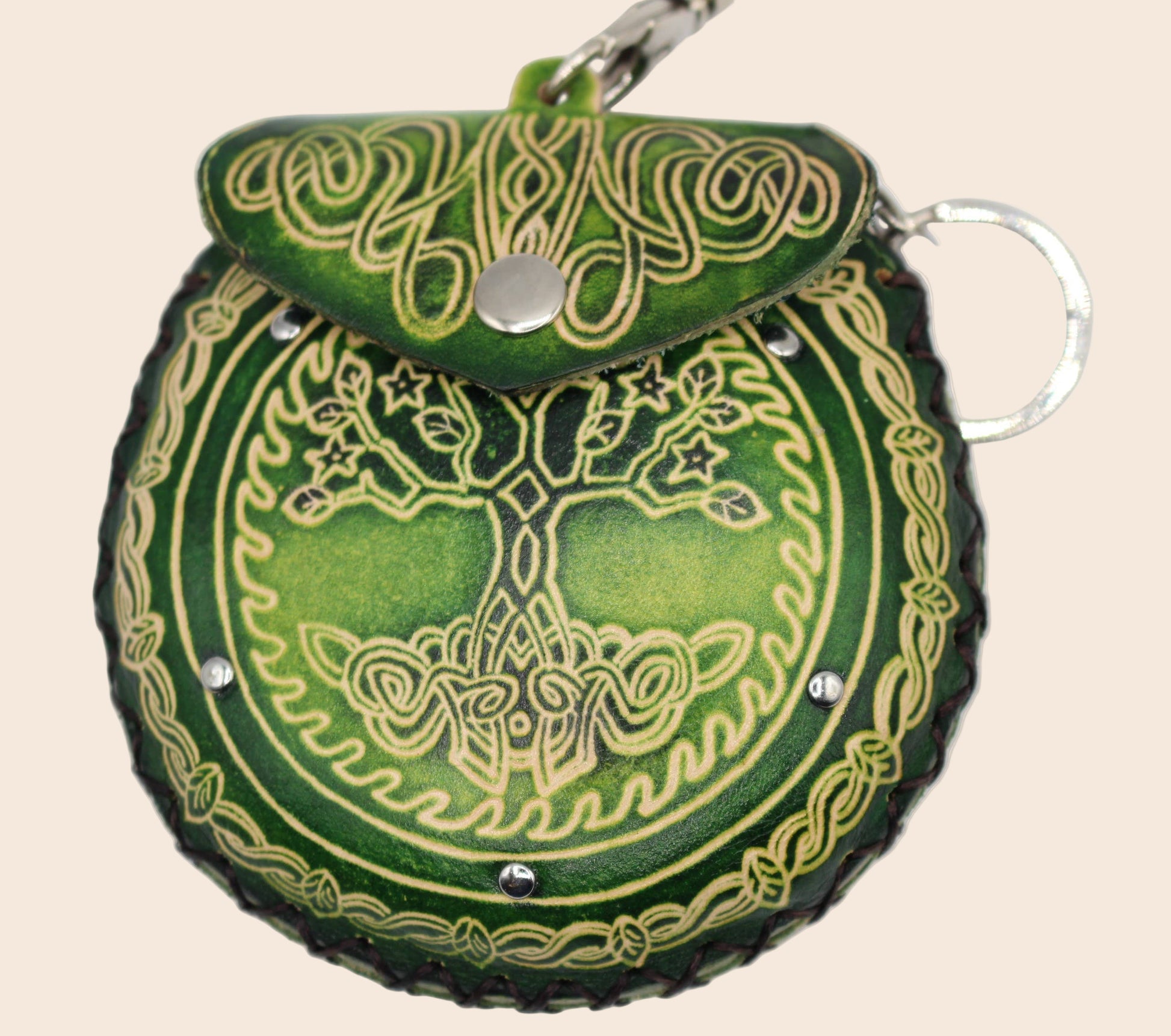 Introducing our exquisite handmade leather coin purse wristlet wallet, featuring a unique tree of life design. Crafted from premium quality leather, this purse is durable and built to last. With its compact size and convenient wrist strap, this coin purse is perfect for carrying your cash while on the go. The intricate tree of life design adds a touch of elegance to your everyday look. This versatile coin purse features a secure zipper closure that keeps your valuables safe and secure. The spacious interior allows you to store all your essentials with ease. The handmade construction ensures that each piece is unique in its own right with slight variations in color or pattern - making it an even more special addition to any wardrobe. So why wait? Add our stunning handmade leather coin purse wristlet wallet featuring the beautiful tree of life design today! size: 3.5 inches ×3.5 inches